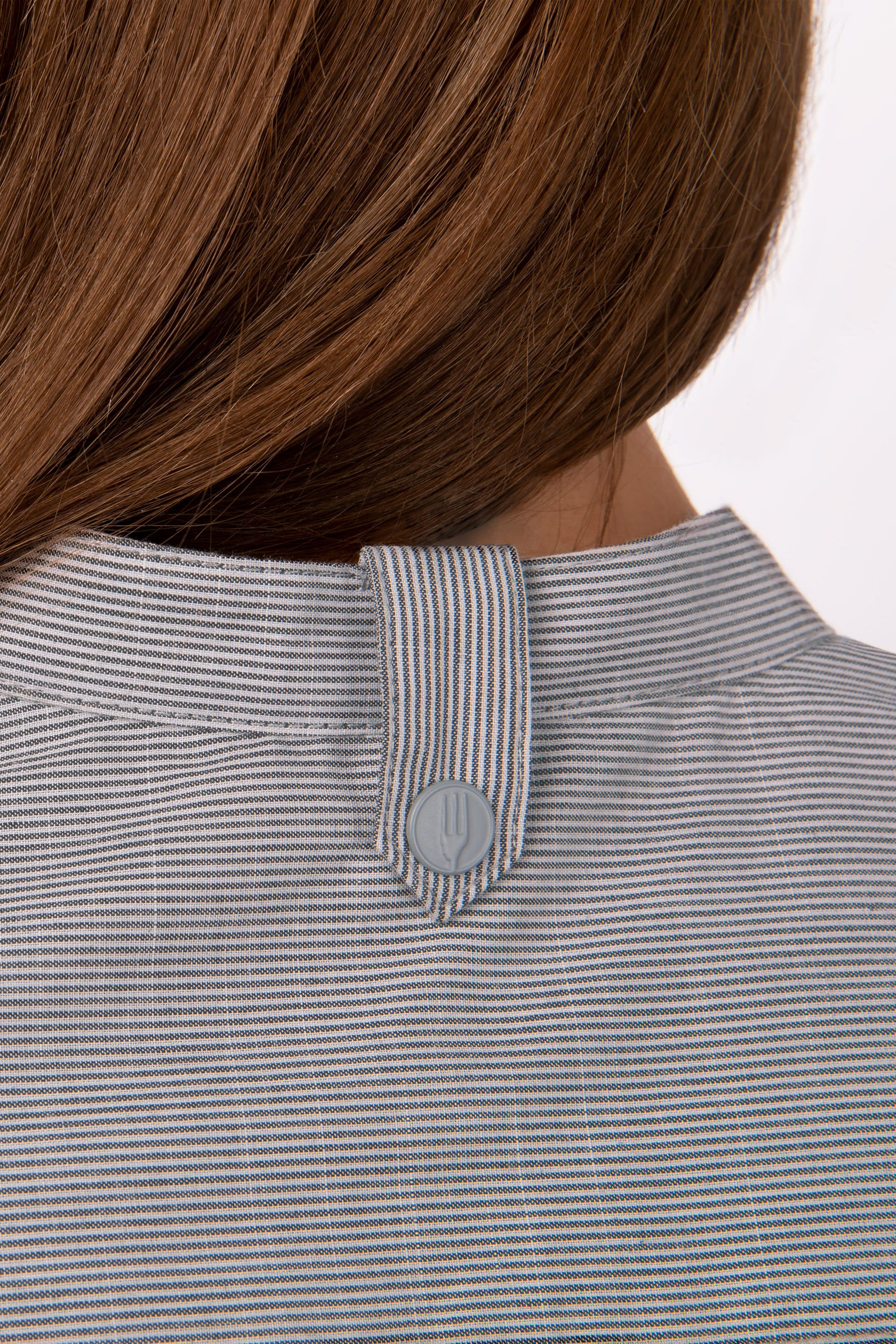 Camisa de cuello mao y manga larga, puños ajustables, cierre de botones delanteros, lengüeta para sujetar el delantal de cuello trasero