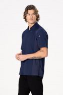 Tejido 135 gramos 65/35 poliéster/algodón sarga ligera 'lite', paneles laterales en tejido Cool Vent™, aberturas en los laterales, manga corta, cierre con cremallera oculta, presilla para sujetar el delantal, bolsillo en manga derecha para dispositivo móvil o libreta.